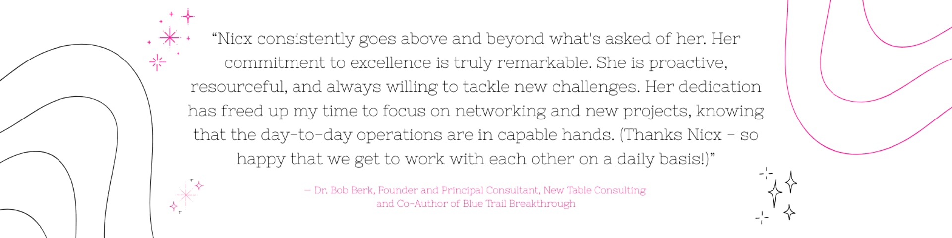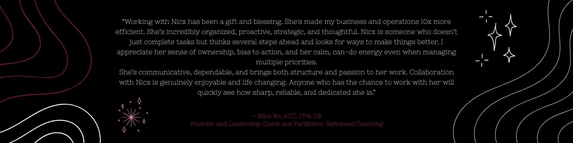 “Working with Nicx has been a gift and blessing. She's made my business and operations 10x more efficient. She’s incredibly organized, proactive, strategic, and thoughtful. Nicx is someone who doesn’t just complete tasks but thinks several steps ahead and looks for ways to make things better. I appreciate her sense of ownership, bias to action, and her calm, can-do energy even when managing multiple priorities.